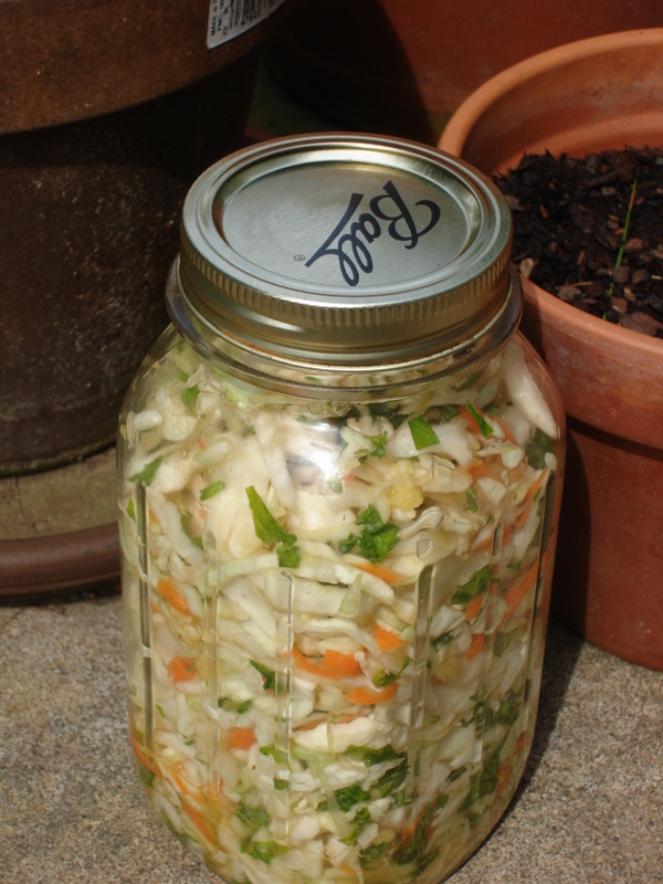 Also when fermenting is it wise to add whey during the preparation. (see post on crackers and yogurt cheese to learn how to make your own.) Whey contains a lot of lactic acid and speeds the fermentation process. If you don’t have any whey to add then adding additional salt will do the job, but it will take longer to ferment and it won’t last as long. When I made kimchi I didn’t add any whey and it took about 1 week to ferment completely. Now with the sauerkraut I did add whey and it should be done tomorrow on day #3.