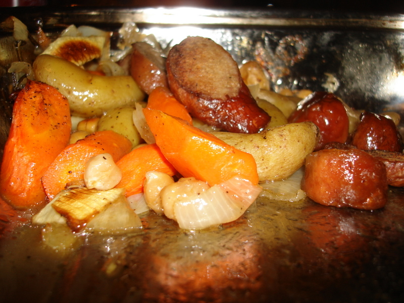 - Position an oven rack in center of oven. Preheat oven to 425 degrees F. Place all vegetables, meat, garlic, and chickpeas in a large shallow roasting pan. In a small bowl combine the oil, rosemary, brown sugar, salt, and pepper. Drizzle over vegetables and meat; toss well to coat.