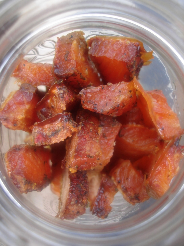 In one of my recent posts from [amazon_link id=”0967089735″ target=”_blank” container=”” container_class=”” ]Nourishing Traditions[/amazon_link] I talked about the chapter on finger foods and mentioned my desire to make salmon jerky. I finally got around to it and I’m so glad I did! I didn’t follow the recipe in [amazon_link id=”0967089735″ target=”_blank” container=”” container_class=”” ]Nourishing Traditions[/amazon_link], but instead just put a few spices (I can’t remember what I put on it… sorry I know that is NOT helpful!) on it, sliced it about ¼ inch pieces and then [amazon_link id=”B001P2FUZC” target=”_blank” container=”” container_class=”” ]dehydrated[/amazon_link] it!