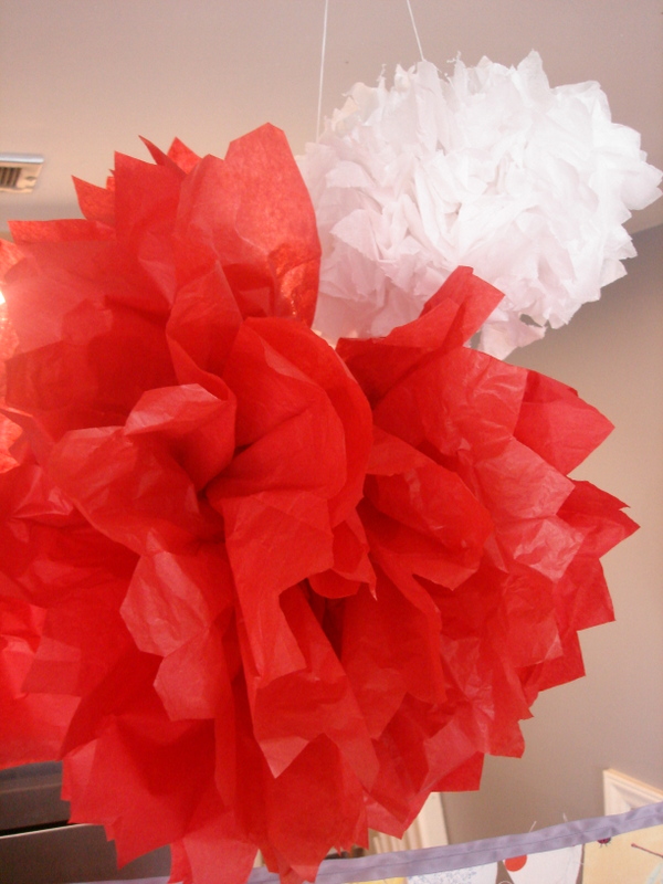 Early in the week we decided to work on the decorations. I definitely kept it simple. I wanted the (very minimal) theme to be red and white with polka dots or flowers. I knew I wanted to make tissue paper flowers to hang from the ceiling over the food area with a simple but fun banner. I didn’t mind if the flowers didn’t last, but I wanted to be able to make a banner that we could re-use year after year.