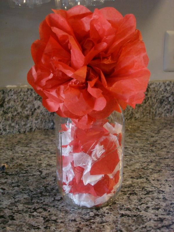 The flowers I had seen online before and knew I’d be able to make it. I found this tutorial on YouTube that was very helpful! We made a large red one and a little white one! I definitely like the white best because I was a little short on the red tissue paper and it wasn’t nearly as full. An added cost saver for these was that I had saved tissue paper from Christmas. It was a little wrinkled, but for this project it didn’t really matter.