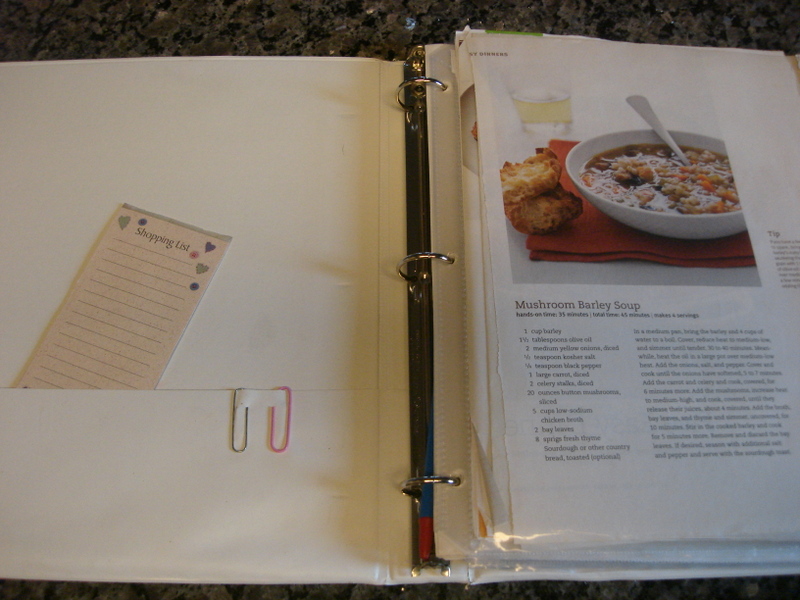 Recipes to Try Sleeve: This is a clear plastic sleeve protector that I keep all new recipes I’d like to try. Friends know I like to look at new food ideas and pass me their magazines. I just tear out the recipes that look good, easy to alter to our diet, and don’t take too much work. As we try them I either add them to the blog to share (if they are easy, cost effective, tasty and healthy), or toss the recipe.