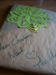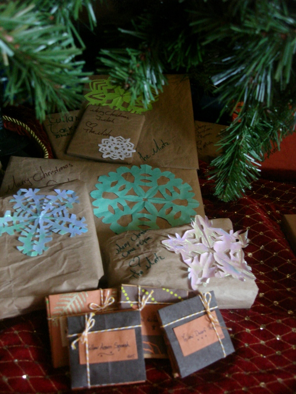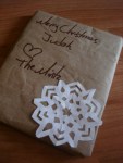 But I can share how I decided to wrap my gifts this year! I saved brown packing paper from online orders throughout the year and used that to wrap the gifts. I then cut out LOTS of snowflakes to paste on top! It was so much fun and the boys like trying their hand at snowflake cutting… and a few of them made it onto gifts as well!