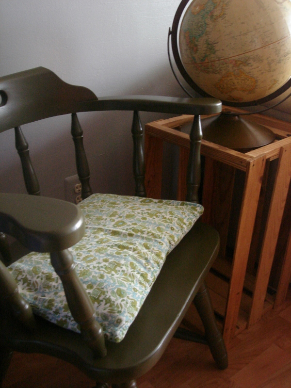 Lastly was a cushion for this chair! Dear hubby found the chair in someones trash and snagged it. I put a fresh coat of paint on it and used the “tank top” pillow as a cushion to match the decor and add some color to the room. I Just LOVE the way this corner turned out! Both the globe and the crate were trash finds too.