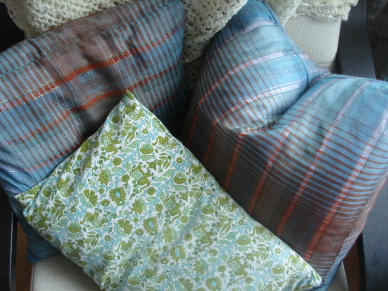 Two pillows still need to be recovered and I’m not exactly sure what fabric I want to use and couldn’t find anything in my box that will work… but I’ve completed three thus far! The two that are alike are from a scarf I found at the thrift store for $1 and the one covered in green and blue is from an old tank top that no longer fit! New pillows for $1 and a little bit of time! Not bad!