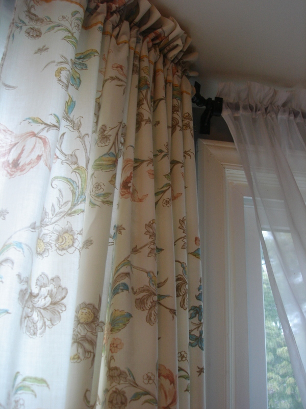 Now that the red curtains are down and these are up there is so much more light coming in the windows and it seems so much bigger and open in our living room. I also tied the sheer curtains on the side windows into flowers and pinned to the side. I may attach some ribbon later, but I haven’t completely decided on that.