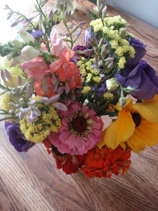 This week upon opening the box it was FULL of beautiful colors! In the past few weeks it’s been a LOT of green! Not that I’m complaining, but I’m happy to see the summer veggies are starting to roll in! AND this week we received some lovely flowers! I just love fresh flowers on the kitchen table! Each time I walk through the kitchen and see the cheery bunch it makes me smile!